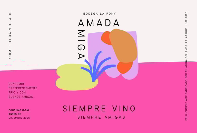 The visual concept was inspired by her colorful and expressive personality, her love for abstract art, and her creative universe. Beyond wine, she is a pastry chef and the founder of La Pony Bakery, with a special passion for medialunas and a strong admiration for the iconic brand FARM.